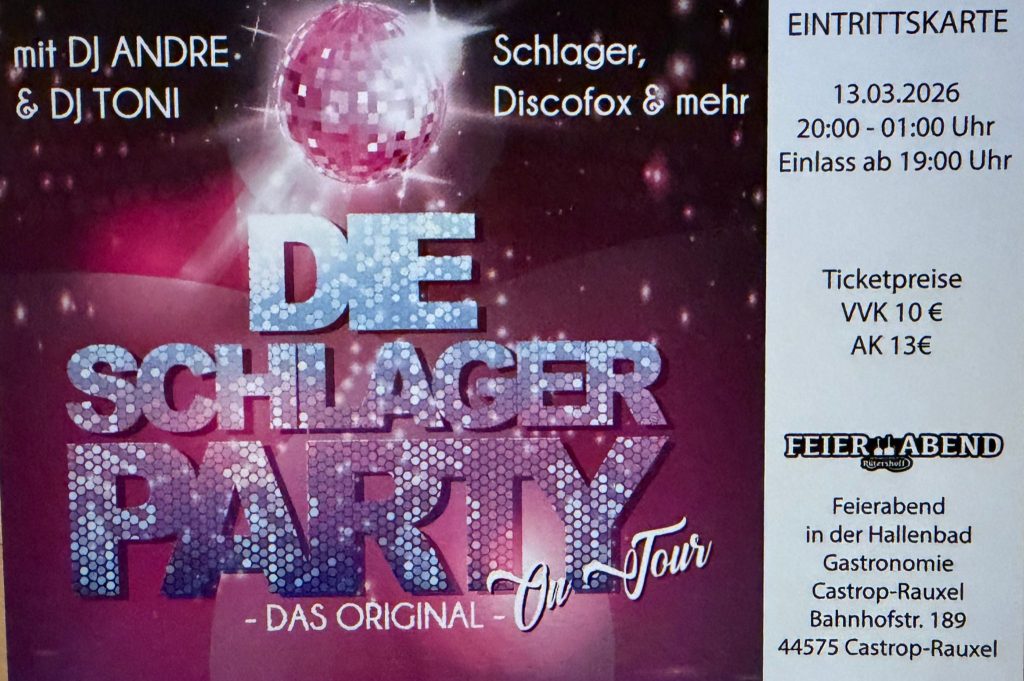Ab sofort sind die Karten für unsere Veranstaltung am 13.03.2026 und am29.05.2026 im Feierabend, Hallenbad Gastronomie, Bahnhofstraße 189 in Castrop-Rauxel und im Brauhaus Rütershoff, Schillerstraße 33 in Castrop-Rauxel erhältlich.